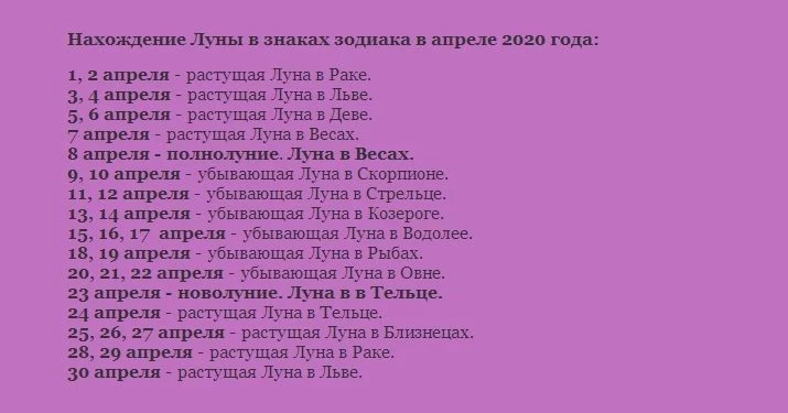 Апрельское нахождение Луны в зодиакальных созвездиях в 2020 году