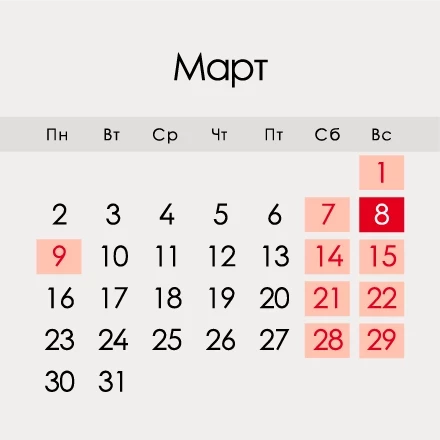 Март – один из самых длинных месяцев по количеству дней: их 31. Выходными в 2020 году будут 10 дней марта, включая праздник: