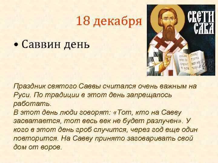 18 декабря Православная церковь почитает память святого Саввы, жившего на территории Палестины примерно в V веке. Появился на свет преподобный в 439 году в семье благочестивых христиан. Когда мальчику исполнилось 8 лет, отца по долгу службы отправили в Александрию, а он остался на попечении родного дяди. Савва стал послушником в монастыре. По возвращению родителей он отказался покидать стены монастыря, и в 17 лет был подстрижен в монахи.
