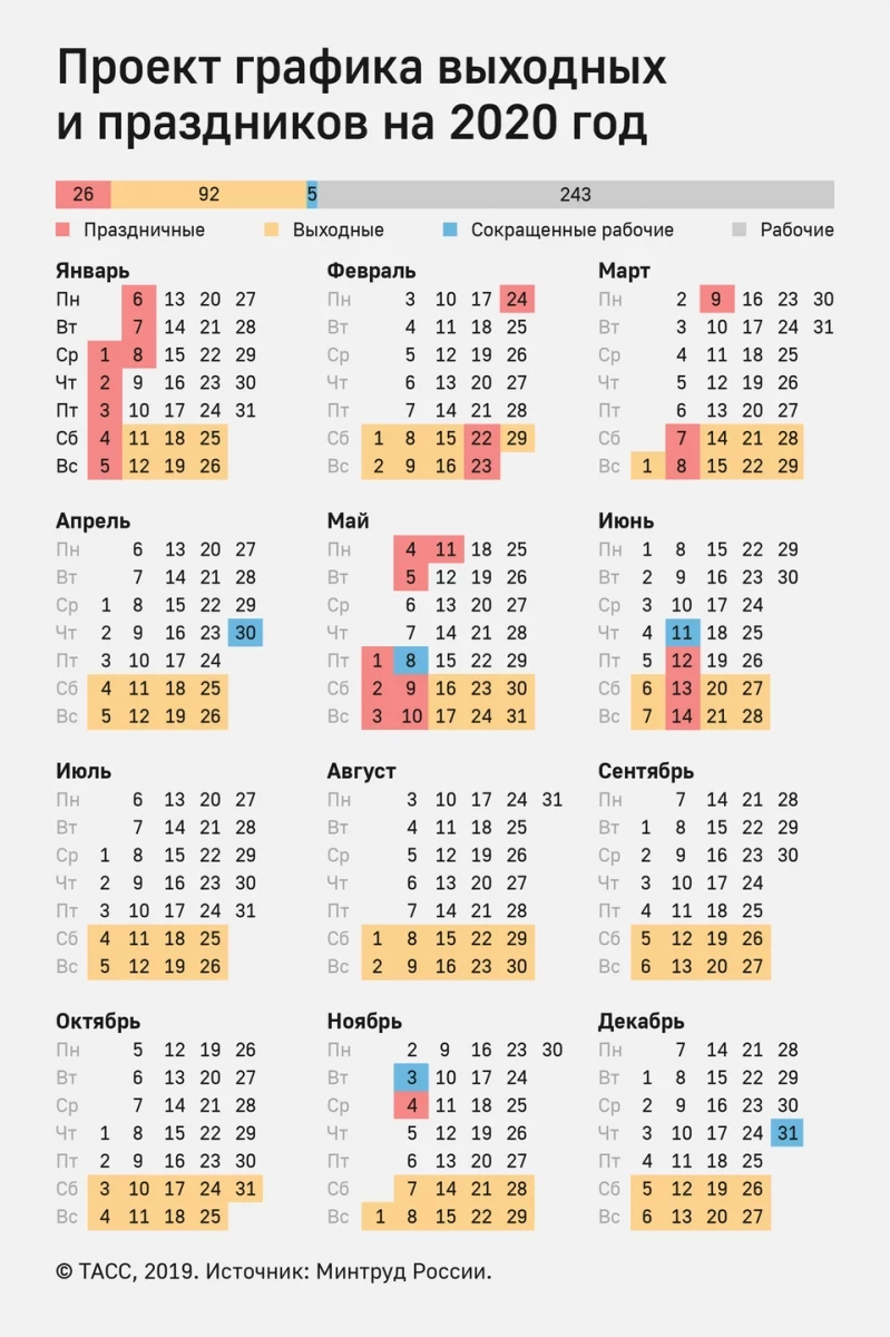 «Планируется, что в 2020 году будут следующие дни отдыха: с 1 по 8 января 2020 года, с 22 по 24 февраля; с 7 по 9 марта; с 1 по 5 мая и с 9 по 11 мая; 12 по 14 июня; 4 ноября», — сказала Голикова.