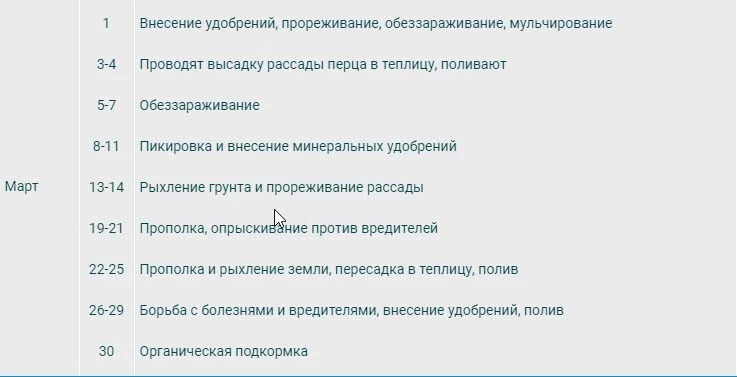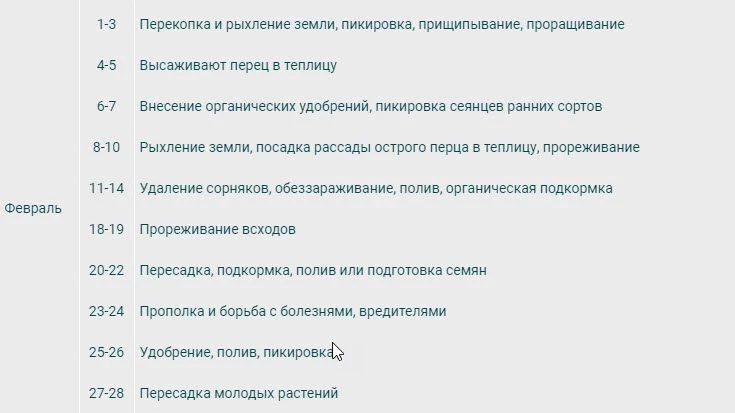 Таблица работ с рассадой перцев по месяцам