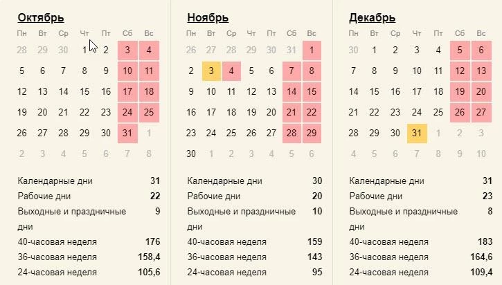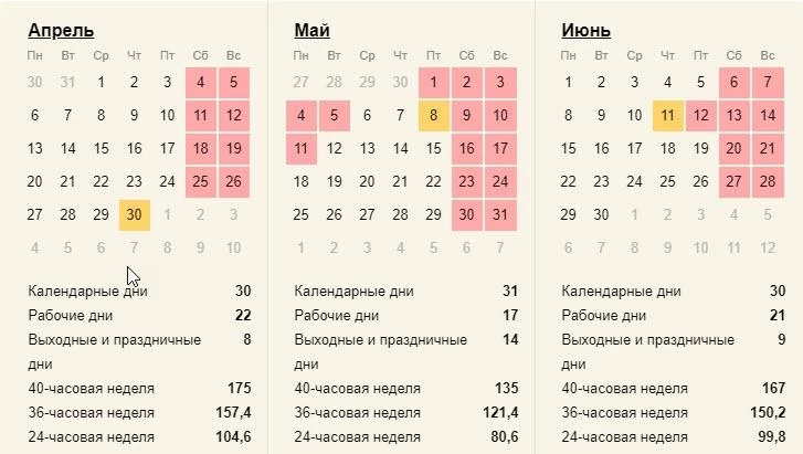 Благодаря нормам рабочего времени 2020, вы сможете узнать об общем количестве календарных, рабочих и конечно же выходных дней в разных временных промежутках: за весь 2020 год, по полугодиям и кварталам, по месяцам. Стоит отметить, что все данные приведенные в таблице, рассчитаны для общепринятой в России 5 дневной рабочей неделе (в 40 часов, 36 и 24 соответственно).