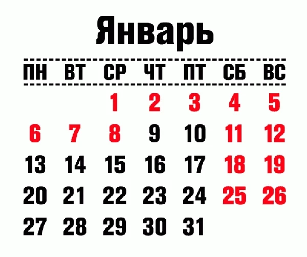 Трудовое федеральное законодательство установило праздничные дни с 1 по 8 января — это Новогодние каникулы и Рождество Христово. Нерабочими праздничными днями в январе являются: