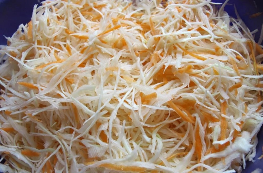 ля начала в большой емкости необходимо приготовить рассол из соли и воды. В то время, пока происходит растворение соли, следует нашинковать капусту, натереть морковь и перемешать их. Моркови необходимо положить только большую горсть, потому что иначе большой объем моркови может вызвать закисание капусты.