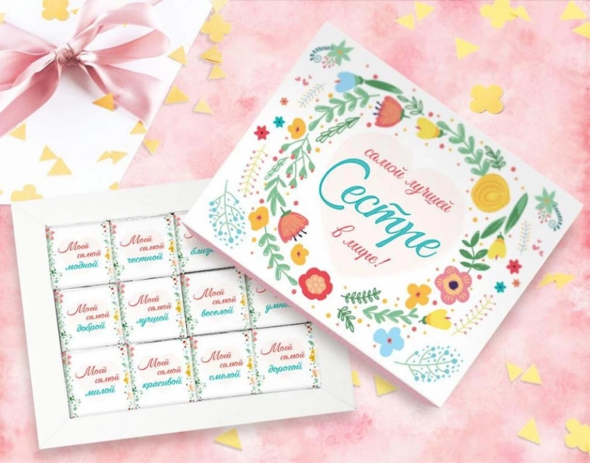 - Сестре парня обычно дарят что-то нейтральное и недорогое, например, шоколадный набор, корзинку с фруктами или новогодний сувенир. Если вы с ней очень близки, можно преподнести красивый кулон.