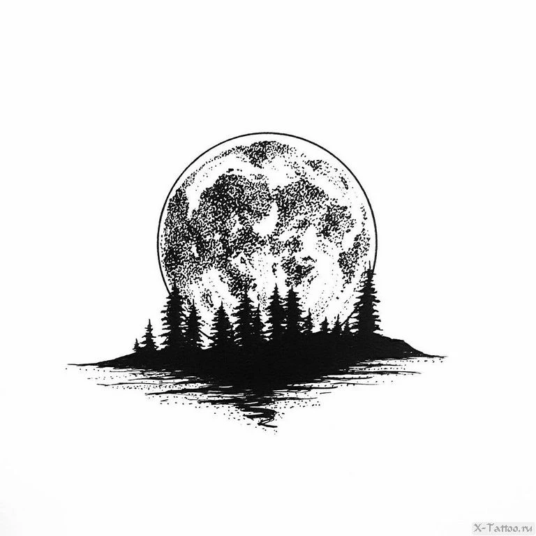 Тату луна является наиболее популярным и загадочным рисунком среди всех изображений небесных тел. Вариантов ее изображения довольно много, это может быть как полная луна, так и полумесяц. Рядом с ночным светилом может быть изображено солнце, звезды и другие небесные тела, а также животные.