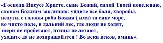 “Помолюсь поутру, да по вечеру Господу нашему. Да попрошу у него здоровья, чтобы ничего не болело, меня не мучило у раба Божьего (имя человека). Пусть встанет да забудет о том, что болело. Аминь”.