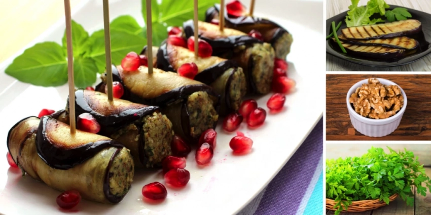 Для начинки грецкие орехи с чесноком измельчить с помощью мясорубки или блендера, смешать с мелко порубленной зеленью и приправами. Смазать полученной смесью полоски баклажанов, свернуть рулетиками и украсить гранатовыми зернами.