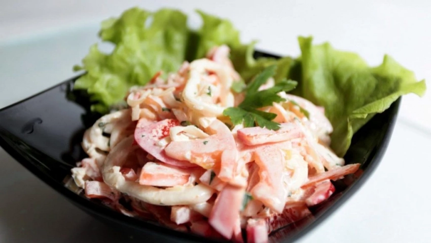 Кальмары очистить, нарезать кружками, обжарить на масле в течение 3 – 4 минут. Лук порезать кольцами, посыпать специями. Поместить в него обжаренные кальмары и сбрызнуть соком одного лимона. Креветки отварить, почистить. Помидоры нарезать полосками.