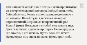 «Пусть летит стрела огненная, полная моего гнева. Не в бровь обидчику летит, не в глаз она летит, а прямо в его сердце направляется. Колоть и резать обидчика она будет и порвет все его будущие надежды. Зло, им совершённое, ему слезами пусть отольётся, все назад к рабу Божьему (такому-то) вернется! Да будет так! Аминь!»