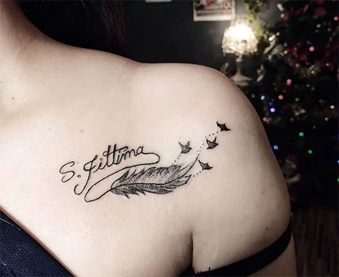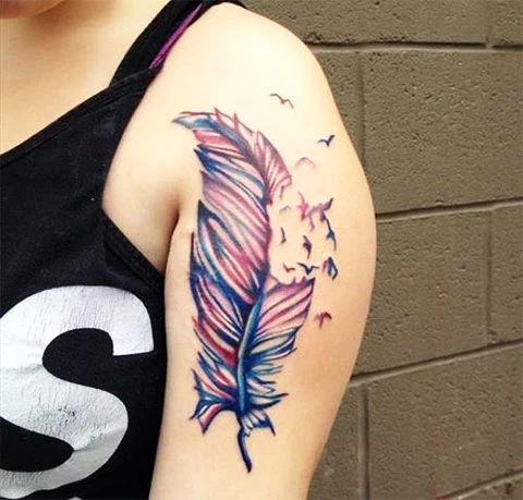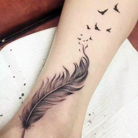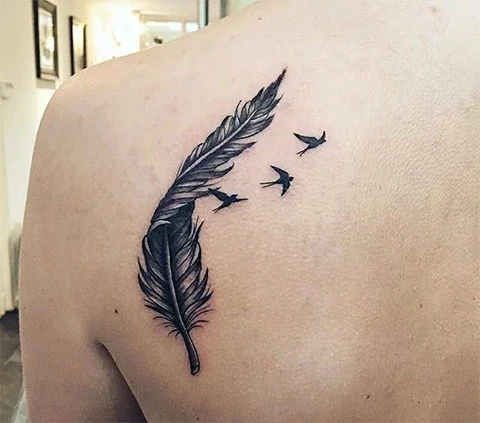 Популярен среди женщин и такой сюжет татуировки, при котором из пера разлетается стая птиц. Данный вариант очень символичен и его значение напрямую зависит от того, какие птицы вылетают из женского тату пера.