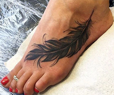 Тату перо на ноге для девушек встречается не менее часто. Перья изображают на голени, икрах и даже бедрах.