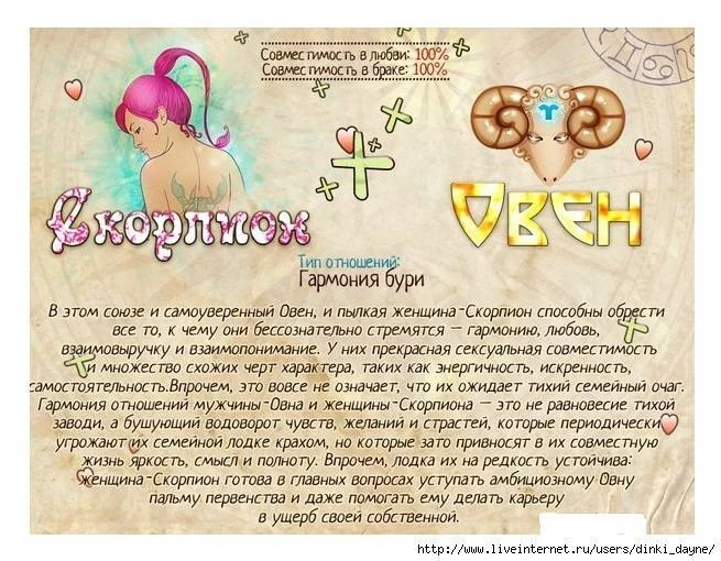 Женщине-Овну Скорпион может принести не только радости, но и огорчения. Такого человека невозможно переубедить и сломить, если он решил настаивать на своем. В отличие от легковерного Овна, Скорпион очень проницателен и его практически невозможно обвести вокруг пальца. Он склонен подавлять женщину, заставлять ее следовать его капризам и желаниям, поэтому женщине нужно немало силы, изобретательности и изворотливости, чтобы добиться своего и не позволять собой манипулировать.