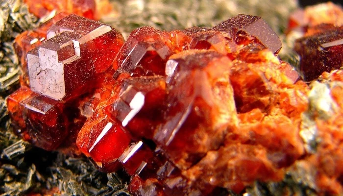 При описании гранатов следует обязательно отметить их разнообразные оттенки, стекловидный блеск, белую черту и неровный излом. Самоцветы крупной или мелкой формы встречаются в осадочных породах с другими видами минералов. Обычно материалом богаты слюдяные сланцы и гнейсы.