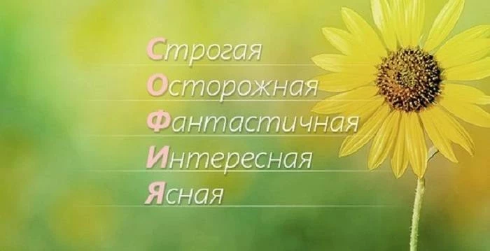 Женщина по имени София покоряет сердца своей добротой, чуткостью и отзывчивостью. Она полностью оправдывает значение своего имени — это действительно мудрый и серьезный человек, проницательный и деликатный. Причем мудрость ее основывается на интуиции и наблюдательности, а не на энциклопедических книжных знаниях.