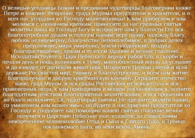 Молитва Петру и Февронии помогает найти свою любовь, хранить верность и преданность. Перед молитвой утром умойтесь святой водой, посетите храм. Начиная молитву поблагодарите Бога и святых за то, что вам дано в жизни. Поставьте свечку у иконы и подумайте о желаемом, представьте счастливую семью.
