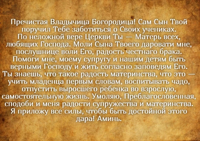 Как читать молитву чтобы выйти замуж Каким же святым произносить, чтобы выйти замуж? Специальной, отдельной молитвы Богородице о замужестве нет, так же как и не существует определенной молитвы Богородице о зачатии ребенка. Однако именно у Девы Марии принято просить помощи об устройстве своей личной жизни.
