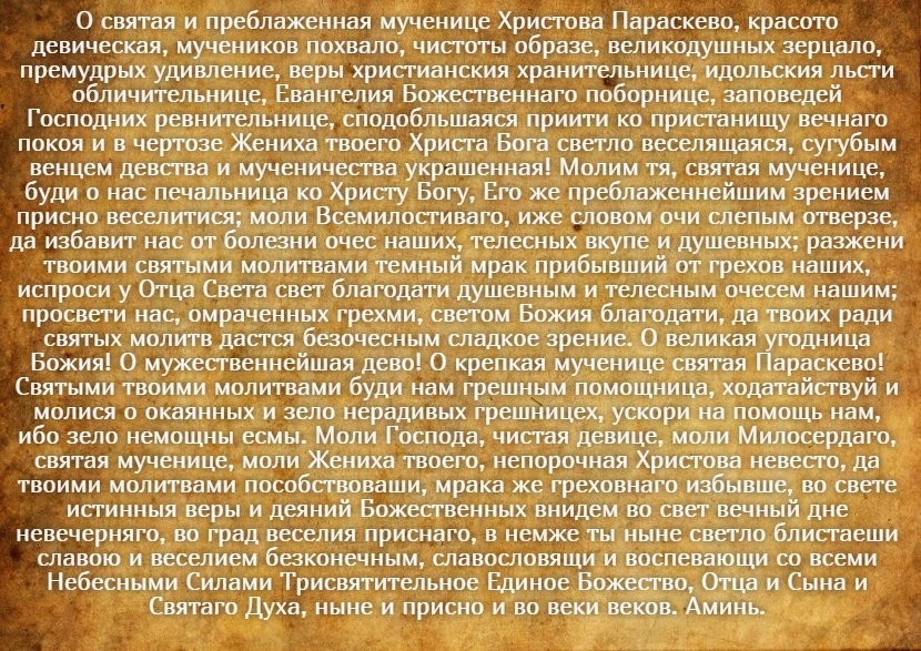 Параскевья исцеляет душевные раны, помогает создавать семейное благополучие, найти мужа или жену и «лечит» пары от бесплодия. Ей молятся молодые девушки, страстно желающие найти свою любовь. День памяти святой отмечают 10 ноября, именно в этот день лучше всего обращаться за помощью.