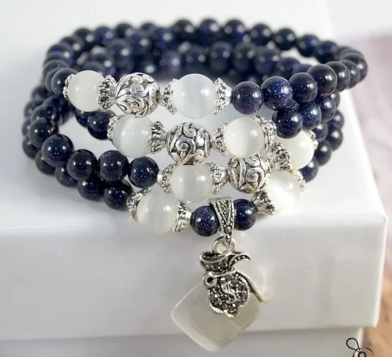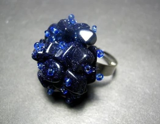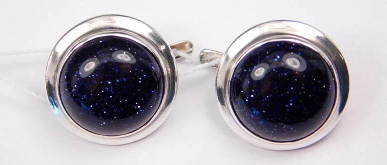 Украшения из синего авантюрина обрамляют белым материалом. Натуральные камни удостаиваются платины или золота, на имитации идет серебро, мельхиор, ювелирный или родированный сплав, медицинская сталь.