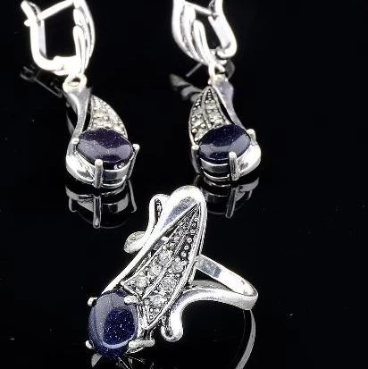 Комплект серьги и кольцо из серебра с синим авантюрином