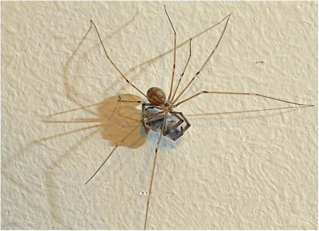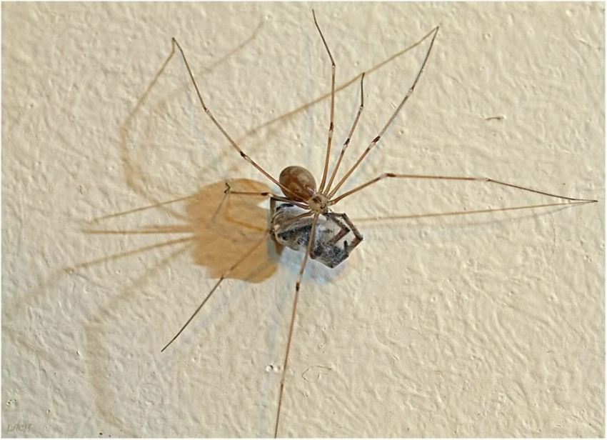 Другие названия – долгоножка, оконный паук. Брюшко небольшое – до 1 см, ножки длинные – до 5 см. Ловчие сети беспорядочно раскиданы по дому. Восьминогое членистоногое предпочитает тёмные углы, зону над окном. Долгоножка следит, когда мошки или мухи попадут на паутину, впрыскивает яд, сразу же поглощает добычу; - пауки-бродяги