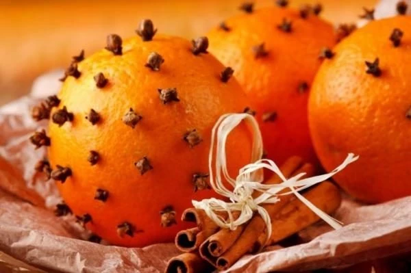 Приготовьте апельсин, зёрна гвоздики, нитку или ленту красного цвета.