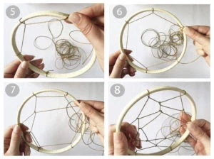 После переходим к плетению паутины внутри основы. Для этого берем более тонкую нитку и привязываем к подготовленному обручу.