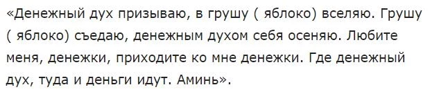 * Заклятье это я шепчу, в богатстве жить весь век хочу. О, демон власти, награди, мне денег много наведи. Чтоб в нищете не пропадать, и у людей взаймы не брать. Да будет так исполнено! Аминь! Аминь! Аминь!