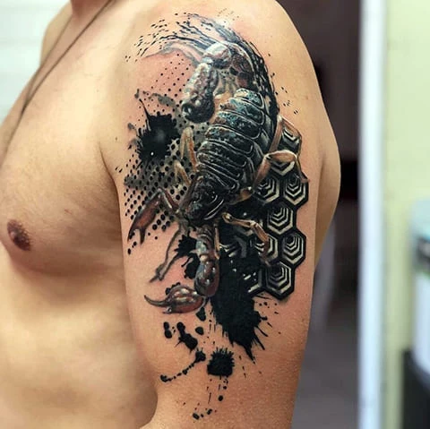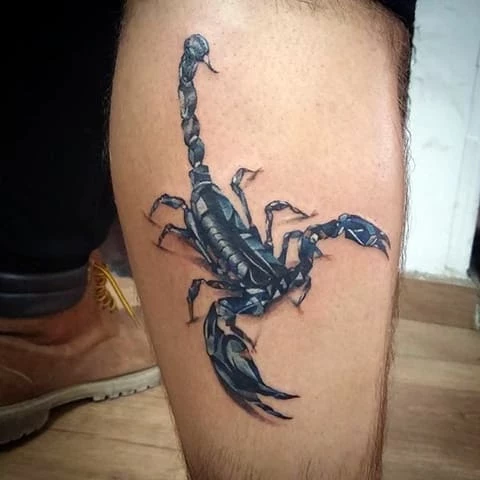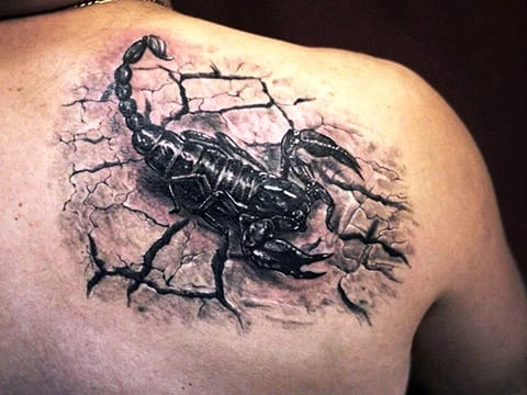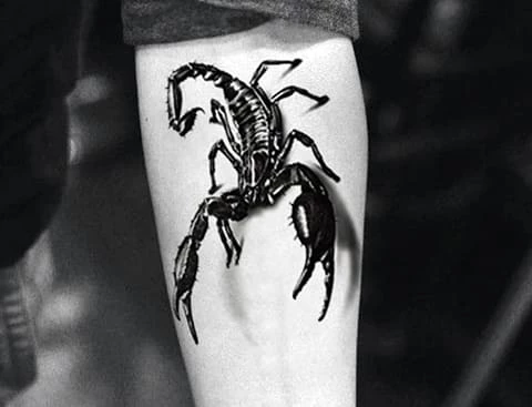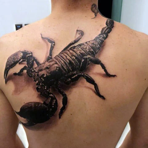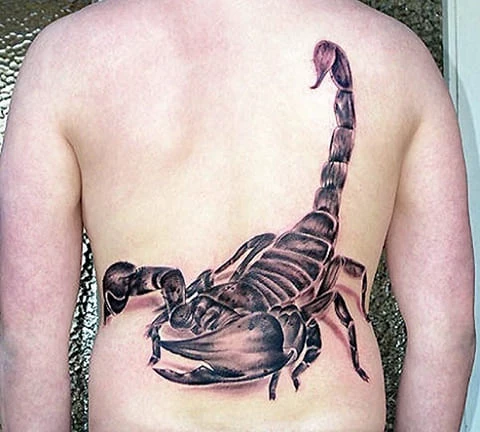 Красиво и завораживающе выглядит объемная мужская татуировка скорпиона. Данную картину можно дополнить изображением песчаных барханов, кактусов, останков животных, костей или черепа. И наносить такую татуировку лучше на спине, груди, пояснице, бедре или лопатке.