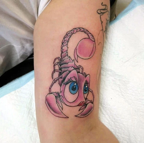 Женская татуировка скорпиона кардинально отличается от мужской. Основным значением такой татуировки на женском теле является показ окружающим независимости характера и серьезности во всех отношениях. Чтобы скорпион не выглядел агрессивно, лучше выбрать изображения с мягкими линиями и небольших размеров. Прекрасно и мило смотрится скорпион, выполненный в мультяшном стиле.