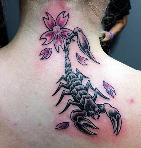 Обычно татуировка в виде скорпиона выполняется в темных тонах (черном, сером или синем). Но девушки часто выбирают красный или голубой цвета. При этом он может изображаться в разных положениях и в сочетании с другими предметами, например, с цветами. Даже простое изображение скорпиона привлекает внимание.