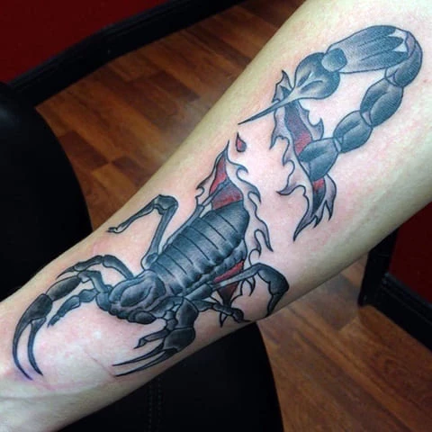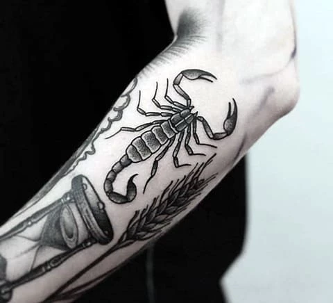 На этом месте чаще бьют татуировки со скорпионами разных форматов, но смысл всегда один. Мужчина тем самым говорит, что всегда буде бороться за свою свободу и атакует врагом без предупреждения. Поэтому с ним лучше дружить, не поступать несправедливо. Тату на предплечье является знаком отваги и мужественности.