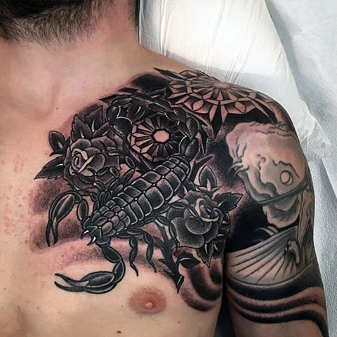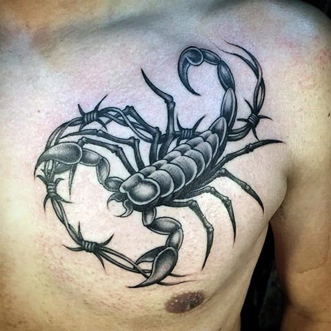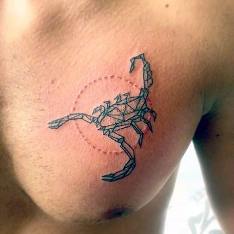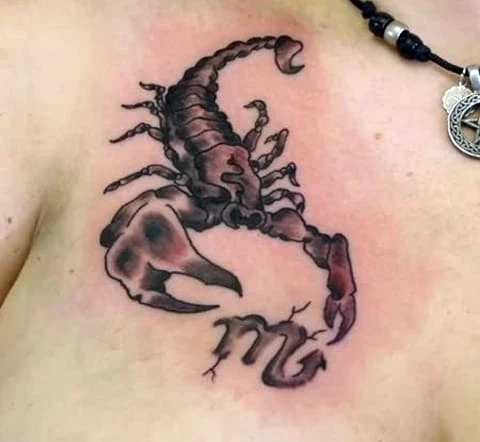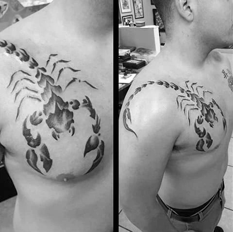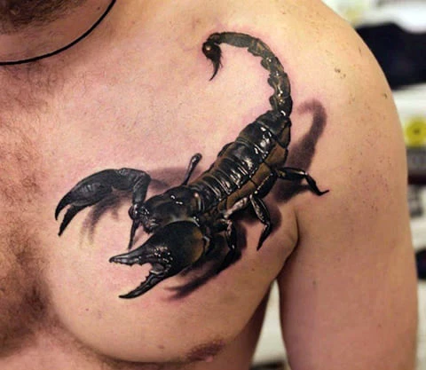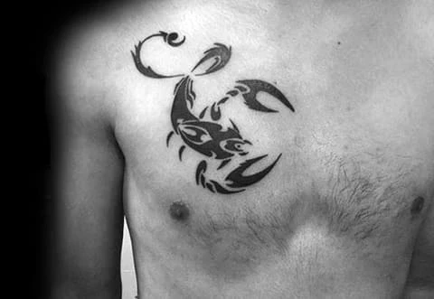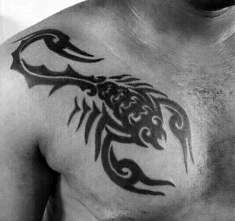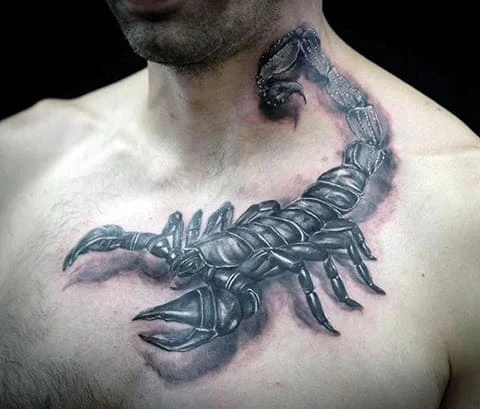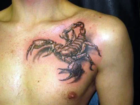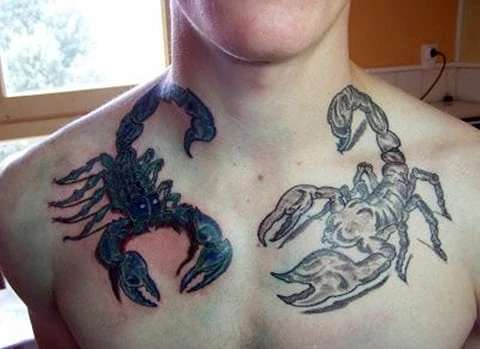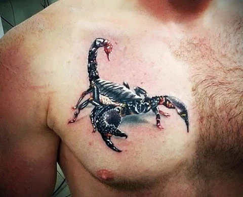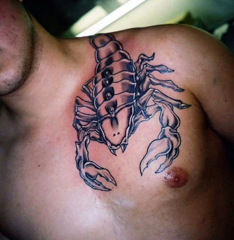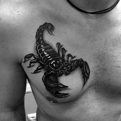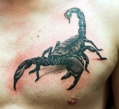Если мужчина предпочитает крупные и яркие рисунки татуировок, набить скорпиона можно на груди. Основное значение такой наколки с левой стороны – честь и отвага, которыми обладает мужчина. Когда насекомое располагается с правой стороны груди – мужчина стремиться защитить сердце от боли и предательств, уберечься от обмана в любви.