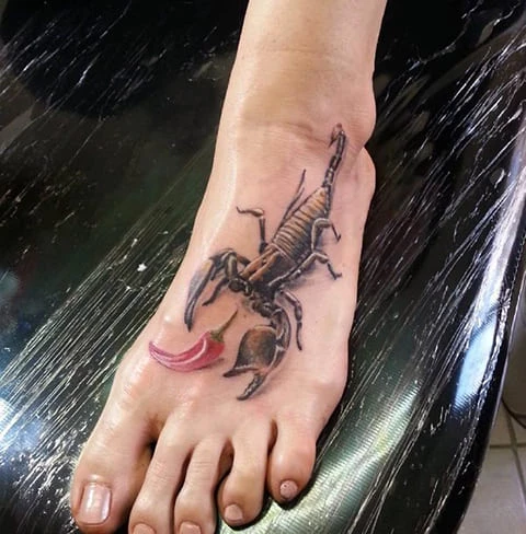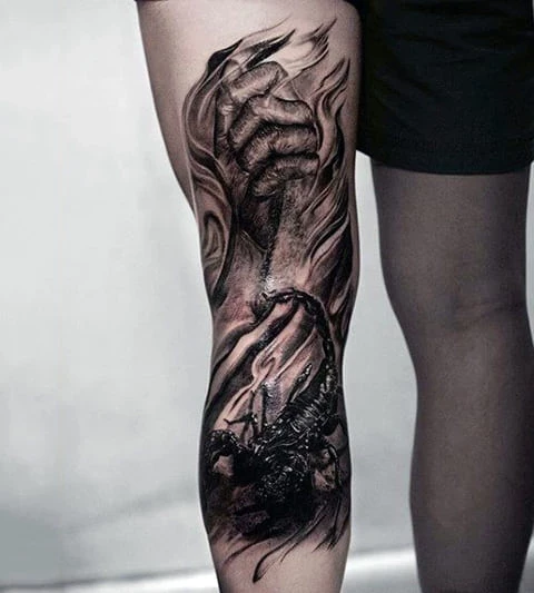 Ноги – это символ стабильность, прочности и непоколебимости жизненной позиции, уверенности в себе. Тем самым татуировка скорпиона на ноге олицетворяет уверенность мужчины в том, что он возьмет от жизни все, поставит перед собой правильные цели и однозначно их добьется любой ценой.