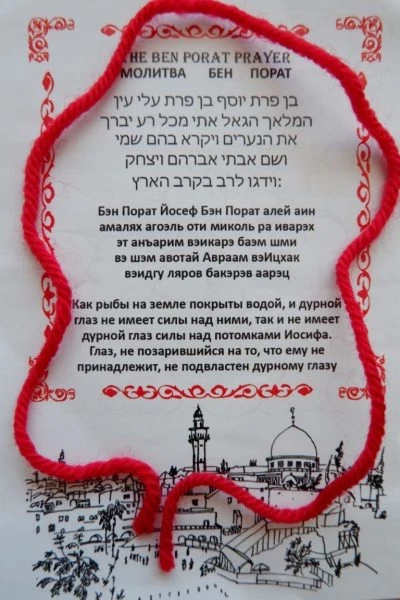 Самым сильным и мощным оберегом считается красная нить, привезенная со «святой земли», с Иерусалима. Многие люди специально едят в Иерусалим только для того, чтобы приобрести там настоящую шерстяную нитку, которая будет охранять их здоровье и счастье. Известно ,что данный оберег продаются прями возле Стены Плача и практически на каждом шагу.