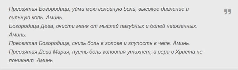 Пресвятая Богородица, уйми мою головную боль, высокое давление и сильную коль. Аминь.