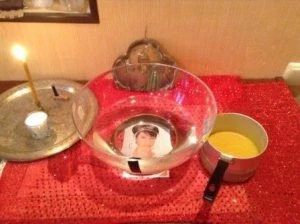 Берём две чашки. В одну из них наливаем питьевую воду, другую оставляем пустой. Находим входную дверь с ручкой, по форме “скоба” и начинаем лить воду из одной чашки в другую так, что бы она текла сквозь душку ручки. Так делаем всего три раза. После чего, эту воду пьём и умываем лицо и голову.