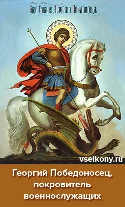Георгий Победоносец – христианский святой, великомученик, к которому следует направлять свои молитвы за здоровье солдата. Святой Георгий отличался своим мужеством, храбростью, умом, могущественной физической силой, красотой. Не зря Святой Георгий назван Победоносцем.