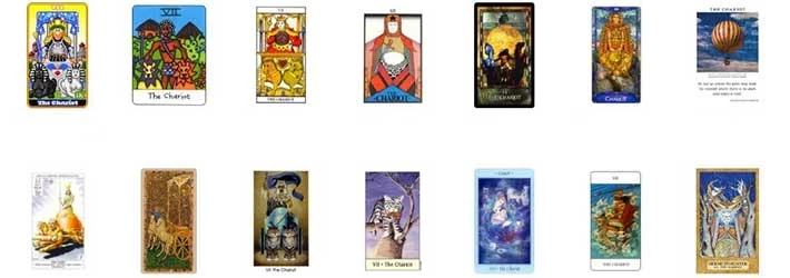 Две лошади, тянущие колесницу, как полагают, представляют эмоции, которыми нужно управлять. В некоторых колодах, лошади заменены львами, которые олицетворяют храбрость и честь в войне, а так же успех в конкурентоспособных действиях. В других колодах изображены черный и белый сфинкс.