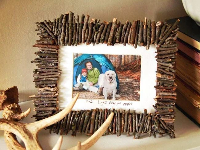 Покупную рамку немного отшлифовать мелкой наждачной бумагой и обезжирить. Затем с помощью клеевого пистолета оформить ее различными элементами декора.В качестве декора можно использовать природные материалы (веточки, гальку, ракушки, шишки, спилы деревьев), нитки, бусины, цветы из фетра, трубочки из глянцевых журналов и другое.