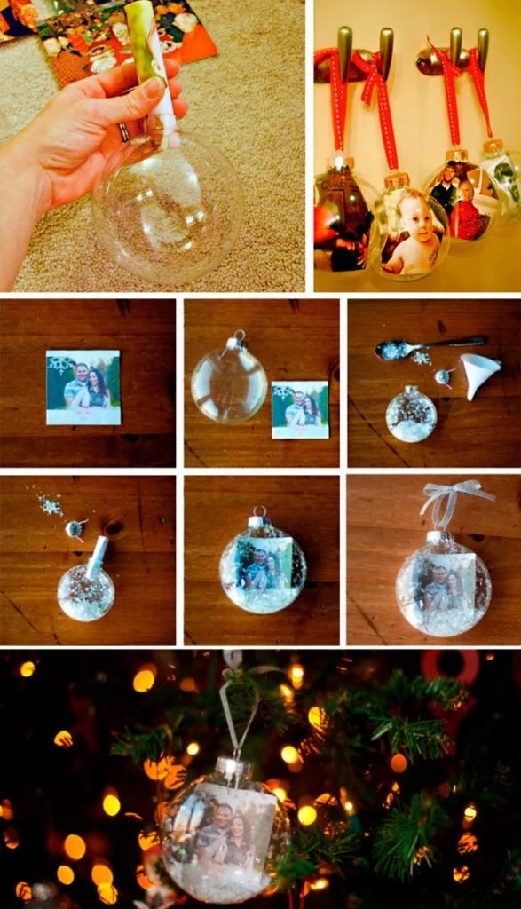 - Елочные игрушки с фотографиями внутри – Вырежьте фото под размер елочного шарика. Вложите в шар, прикрепите к нему петельку.