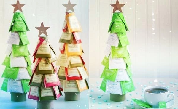 - Елка из чайных пакетов – Обклейте картонный конус чайными пакетами, придав форму ели. Можно украсить чайную елку лентами и блестками.