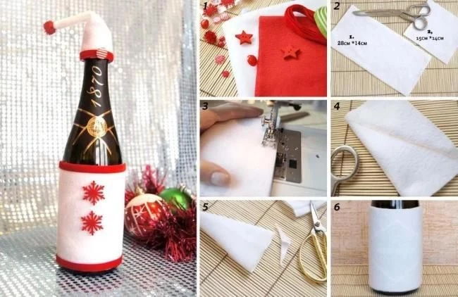 Новогодняя бутылка – бутылочка спиртного может мастерски нарядиться в праздничную. Для этого необходимо сшить часть белого фетра по объему бутылки. Украсить фетром красного цвета и пуговицами или нашивками. Смастерить шапочку, завернув белый фетр и сделать верхушку красной.