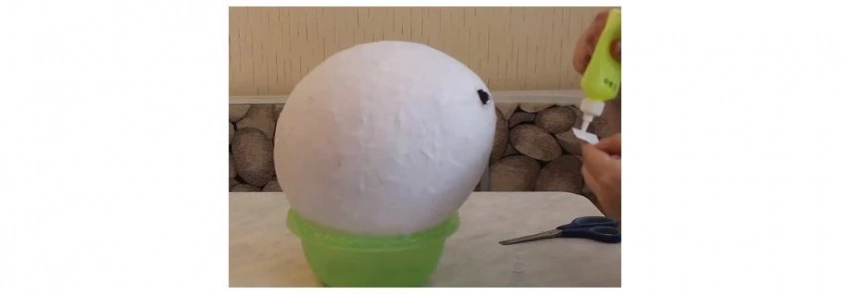 Надув шарик до необходимого размера, завязываем его крепкой ниткой и устанавливаем в глубокую миску, используя ее в качестве подставки.
