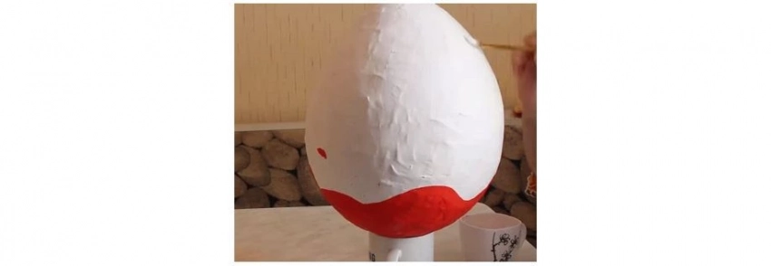 Для маскировки стыков покрываем яйцо толстым слоем белой краски. Дождавшись ее высыхания, простым карандашом намечаем на нижней части яйца контур волн и капель, а затем закрашиваем их, используя красную краску. Для того чтобы краска не растрескивалась и не оставляла следов на руках, смешиваем ее с небольшим количеством клея ПВА.