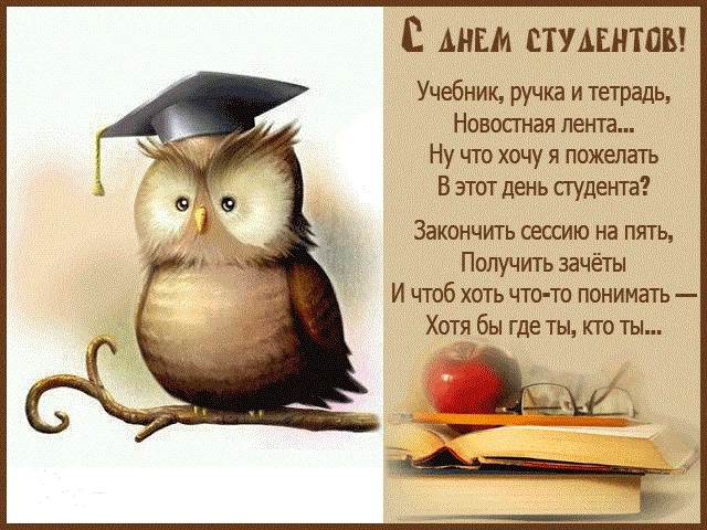 С праздником, мой дорогой студент! Желаю, чтобы каждая страница твоего учебника была для тебя захватывающей сценой из интересного романа. Чтобы экзамены превратились во встречу старых добрых друзей, которым есть, что вспомнить. Даже если вспоминать вы будете забытые формулы, незнакомые законы и не выученные правила, пусть в зачетке всегда стоит только 5!