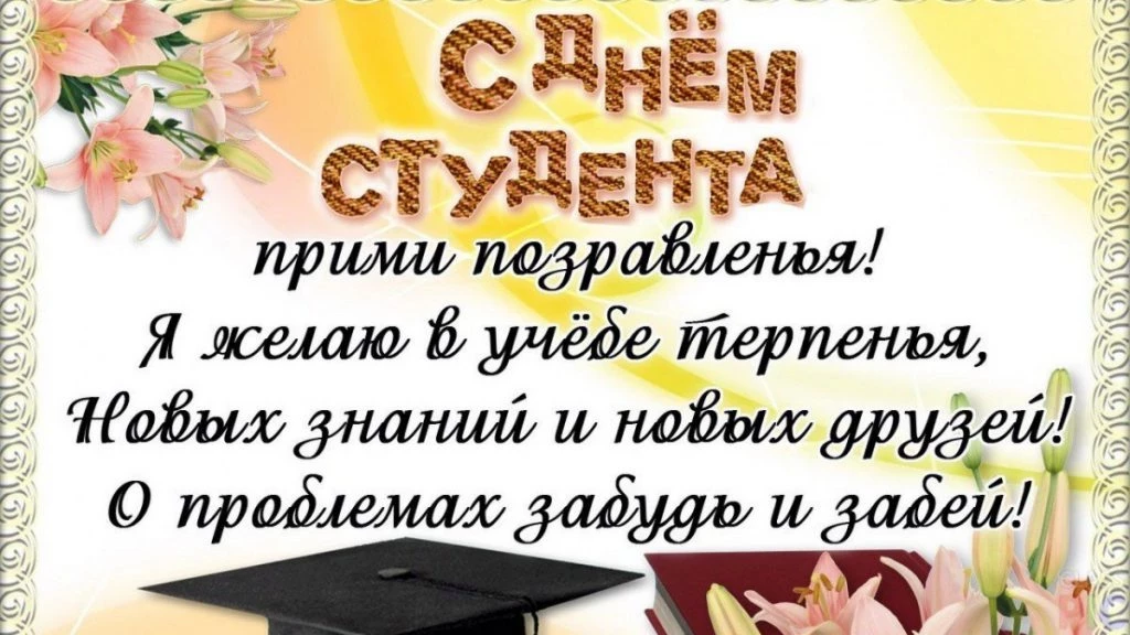 Поздравляю с Днем студента, с праздником юных мечтаний, новых знаний, интересных увлечений и веселого студенчества. Желаю, чтобы каждый день был полон новых целей, уверенных стремлений, замечательных идей, забавных историй и личных побед. Пусть годы студента будут запоминающимися и счастливыми, пусть верные знания и неутомимый энтузиазм приведут к любимой и престижной профессии!