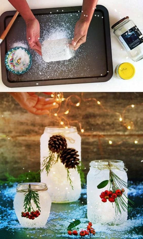 - Подсвечник – Намажьте банку из стекла клеем. Обсыпьте солью, прикрепите листья рябины или шишки к бечевке. Смажьте клеем горлышко у банки и прикрепите веревку с украшением. В банку поставьте свечу.