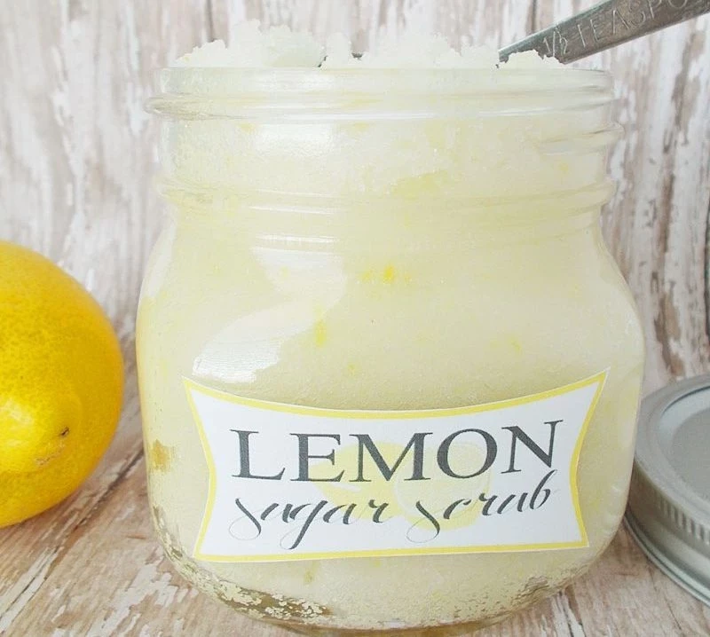 - Лимонный скраб – Смешайте 2,5 стакана сахара с кокосовым маслом (1/4 стакана). Растопите в водяной бане. Добавьте тертую лимонную цедру и сок. Переместите в банку и красиво оформите.