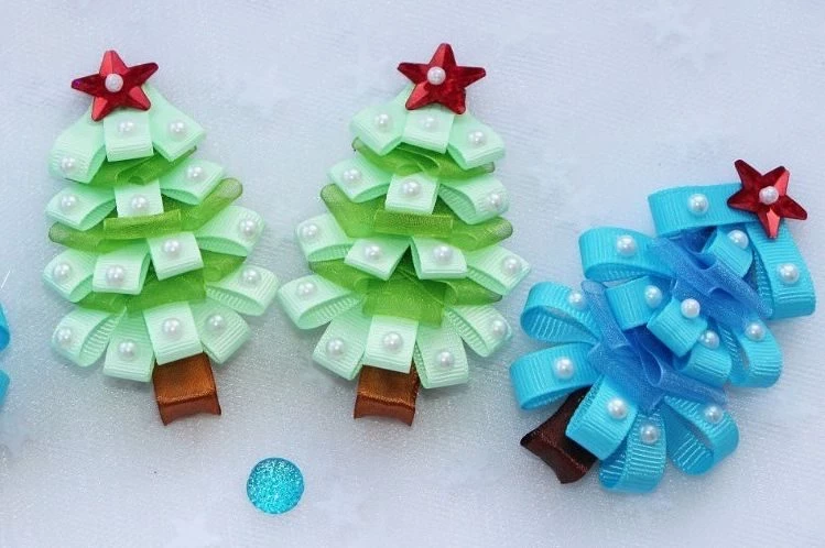 - Заколка-елка – на каркас заколки прикрепите клеем кусочки нарезанной ленты. Украсьте бусинами.